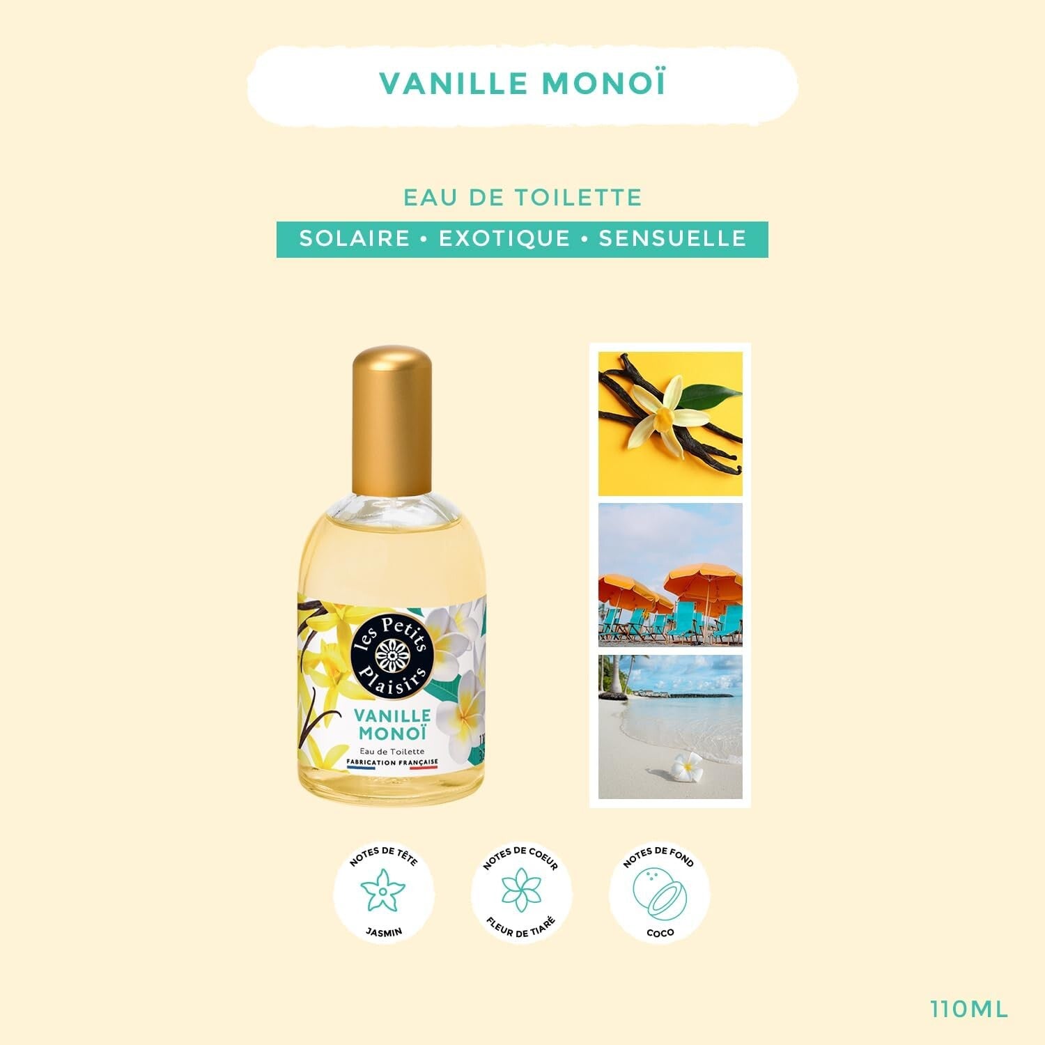 Vanille/monoï , coco et fleur de tiaré.