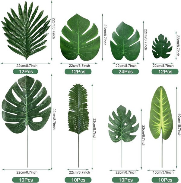 Contient 60 feuilles tropicales artificielles sans tiges et 40 feuilles tropicales artificielles avec tiges.