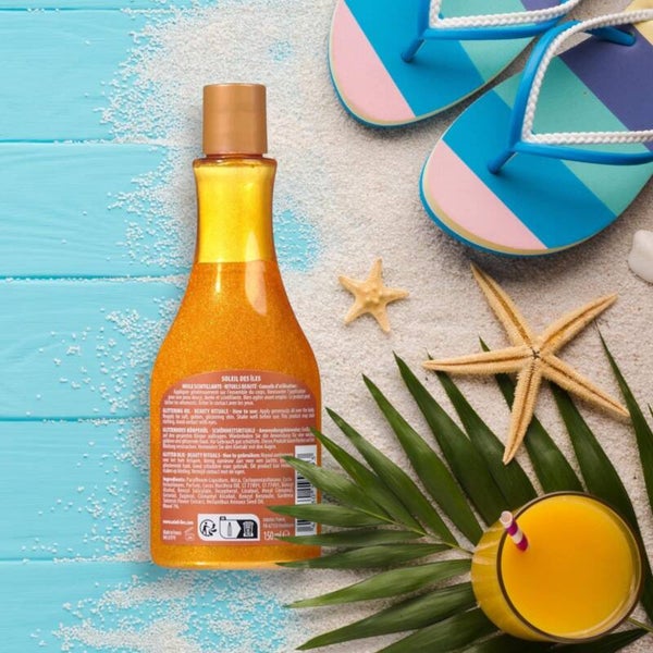 Huile scintillante, parfum tiaré. Soleil des îles. Illumine le bronzage.